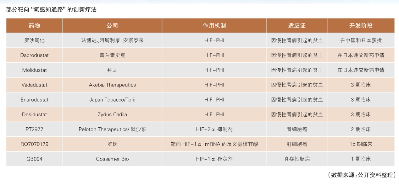 治疗贫血方面,安进公司(Amgen)生产的重组人促红细胞生成素是一款已经有30年历史的有效疗法。重组人促红细胞生成素也是“氧感知通路”的下游靶点,受到HIF-1蛋白的调控。近年来,多家生物医药公司已经开发出创新疗法,通过提高HIF-1蛋白的水平来调节人体对缺氧状态的反应。由于HIF-1蛋白能够调控与解决缺氧状态相关的多个生理过程,包括血红细胞的生成和铁元素的运输等,因此,靶向HIF-1蛋白的调控剂有望获得比重组人促红细胞生成素更好的治疗效果。