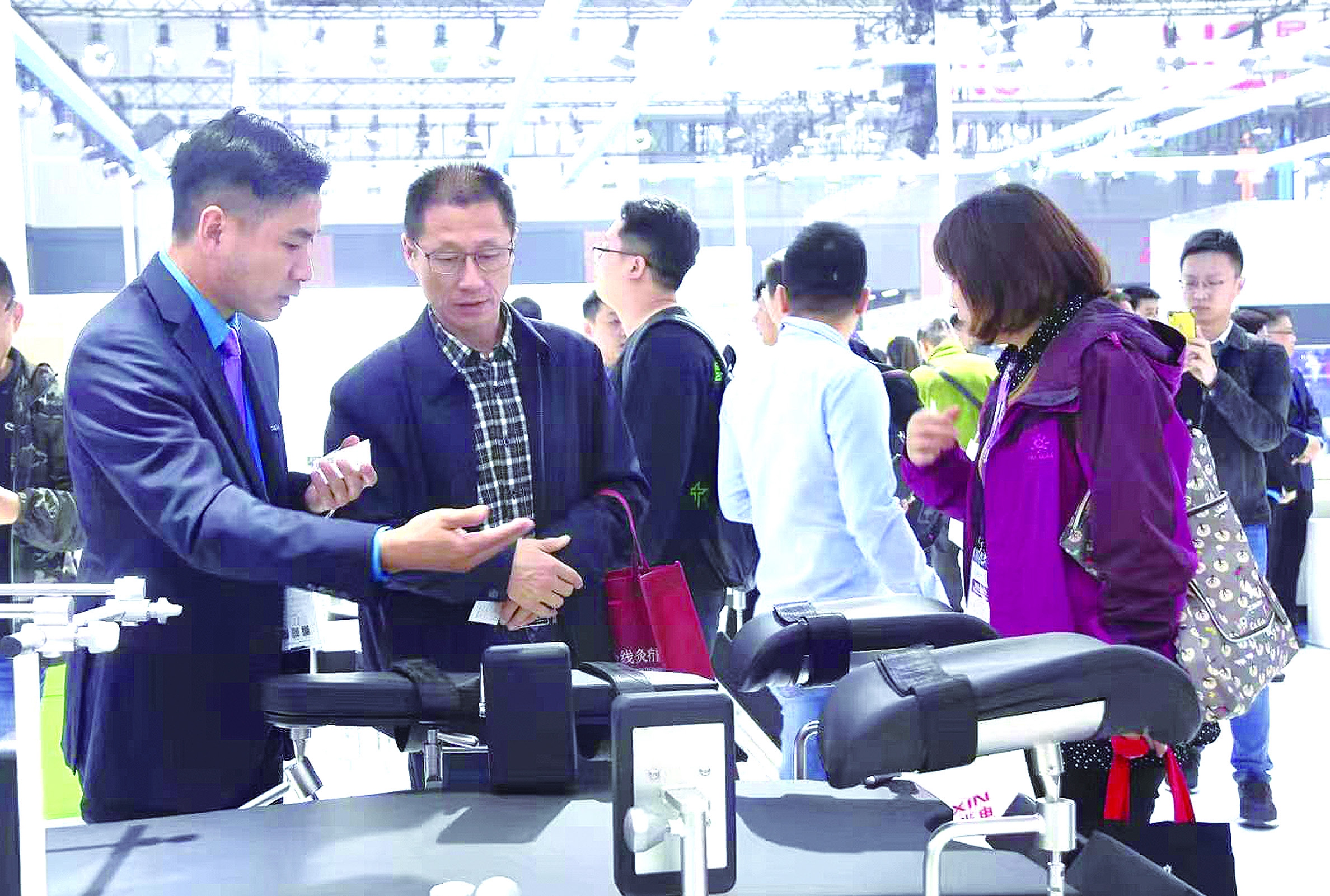 图为山东新华医疗器械股份有限公司展台工作人员向参观者介绍医用电动液压手术台。车宪民 李津民 摄影报道