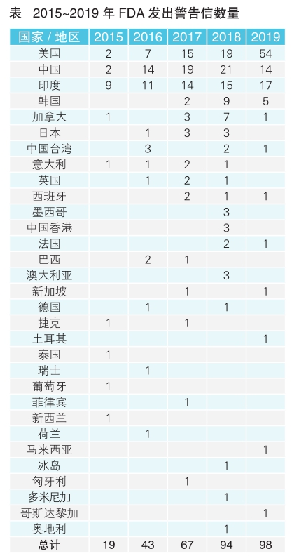 此外,Ashl ey 还指出,2015~2019财年,FDA发出的警告信数量有所增加(见表)。2019财年,收到FDA警告信最多的国家是美国,高达54 封;其次是印度(17封)和中国(14封)。而前些年FDA 对印度或中国发出的警告信数量超出美国本土,目前尚不清楚这些变化是与国外检查数量有关,还是因为美国公司的合规状态陷入低迷。