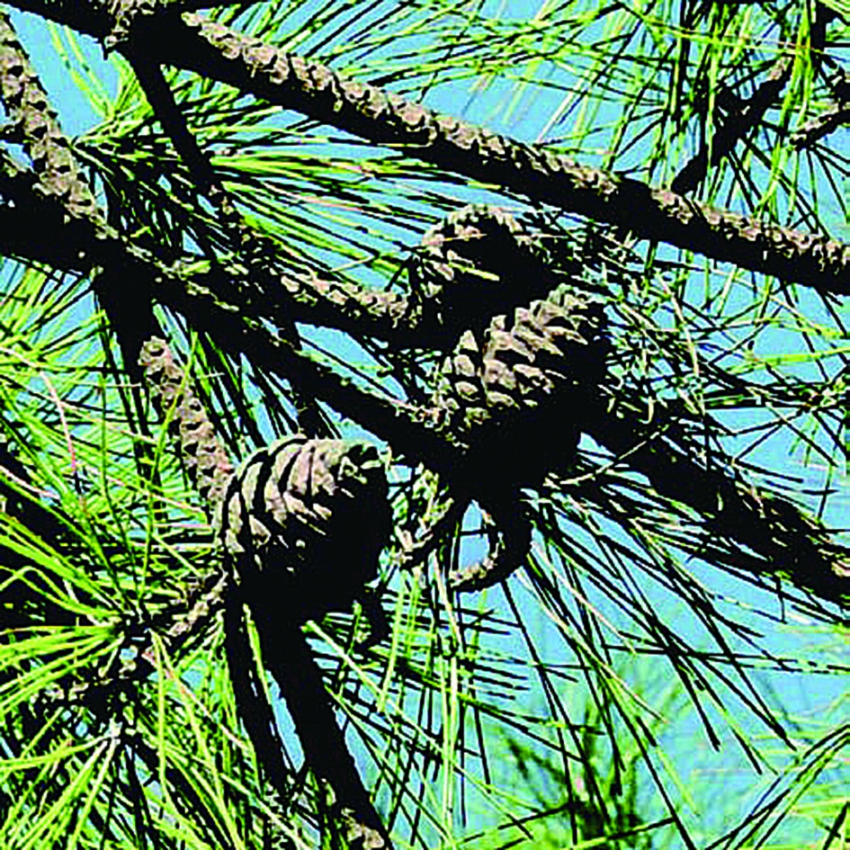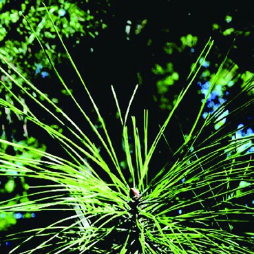 针叶2针一束,深绿色,粗硬,长10~15厘米,径约1.5毫米,边缘有细锯齿,两面具气孔线,横切面半圆形;叶鞘初呈淡褐色,后呈淡黑褐色。
