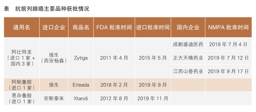 强生阿比特龙于2015年5月在我国获批上市,与泼尼松联用治疗转移性去势抵抗性前列腺癌(mCRPC)患者。2018年12月,阿比特龙新适应证通过优先审评获国家药监局批准,与泼尼松或泼尼松龙联用,治疗新诊断的高危转移性内分泌治疗敏感性前列腺癌(mHSPC),包括未接受过内分泌治疗或接受内分泌治疗不超过3个月的mHSPC患者。