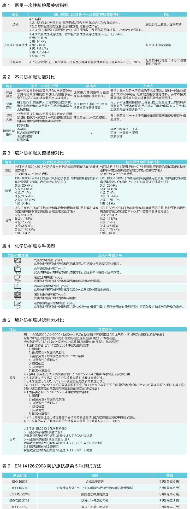 满足防护服的阻隔标准后,如果同时满足EN14126:2003《防护服:防护服抗感染性能要求及试验方法》测试方法的(见表6),说明其防护服面料符合相应级别的抗感染源穿透性要求,可以在Type后面加个尾缀B,在产品外包装标示防止生物危害的图标,即为符合EN14126:2003的各种防护服型号(Type3B、Type4B、Type5B等)。日本JIST8122:2015《针对生物学上危险物质的防护服》与EN14126:2003标准等同。