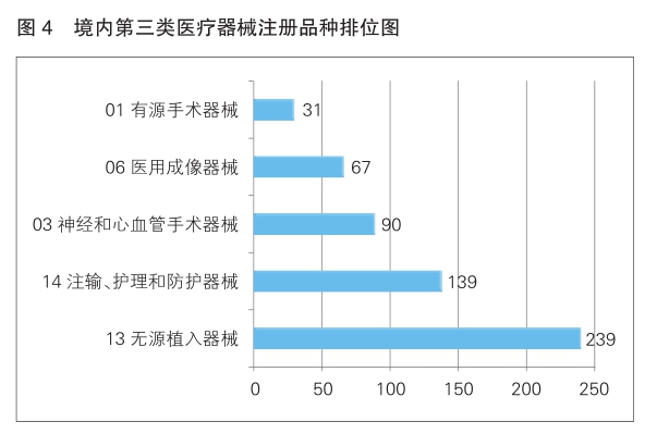 注册数量前五位的境内第三类医疗器械是:无源植入器械,注输、护理和防护器械,神经和心血管手术器械,医用成像器械和有源手术器械。境内第三类医疗器械注册品种排位见图4。