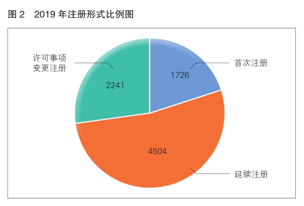 按照注册形式区分,首次注册1726项,占全部医疗器械注册数量的20.4%;延续注册4504项,占全部医疗器械注册数量的53.2%;许可事项变更注册2241项,占全部医疗器械注册数量的26.4%。注册形式比例情况见图2。