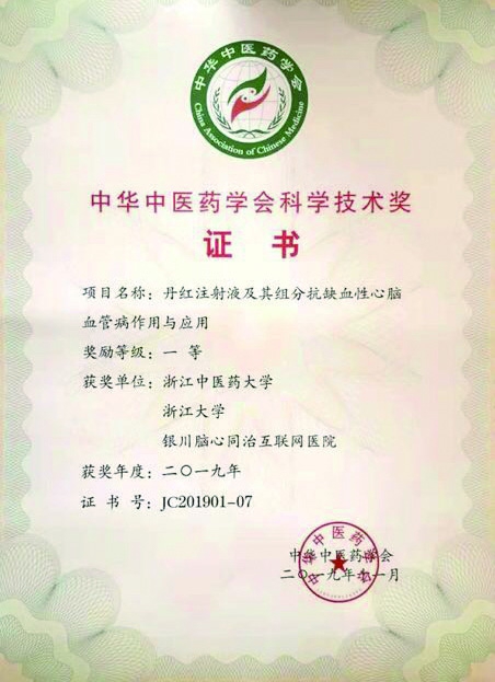 步长制药《丹红注射液及其组分抗缺血性心脑血管病作用与应用》项目荣获2019年度中华中医药学会科学技术奖一等奖证书。