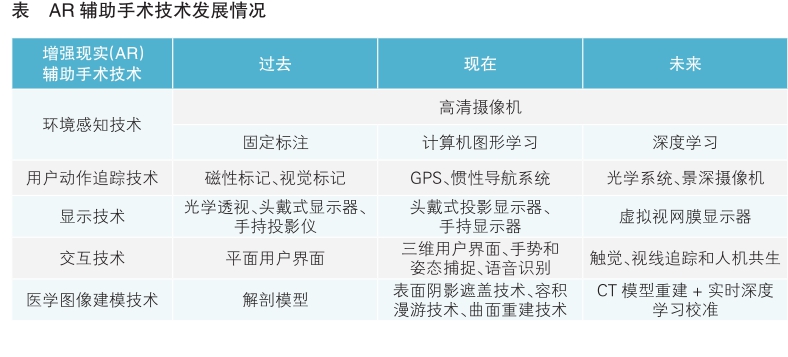 AR在临床手术中的应用横跨计算机科学、计算机视觉、传感器、通信、临床医学、人体工程学等诸多学科,技术涉及面极广。未来,动作追踪、环境感知及图像处理将更偏向以深度学习为代表的智能技术,显示器和交互传感器将更多应用与人体器官高度关联的技术,如视网膜显示器和人机共生技术(见表)。