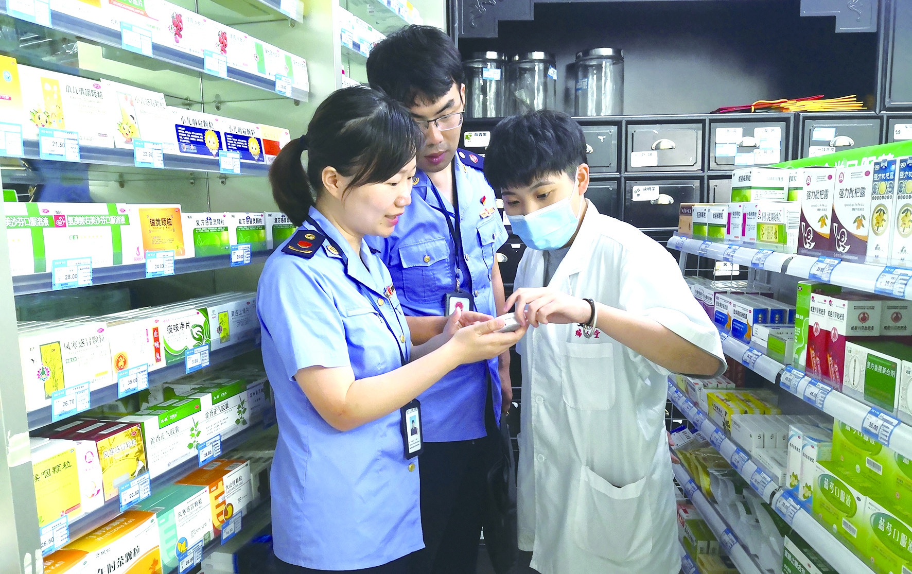 图为执法人员在一家零售药店检查。潘怡廷 摄