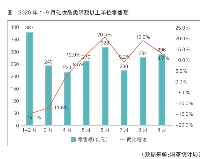 根据国家统计局发布的数据,今年9月,化妆品类限额以上单位零售额同比增长13.7%,达到296亿元,化妆品零售额连续6个月实现正增长。