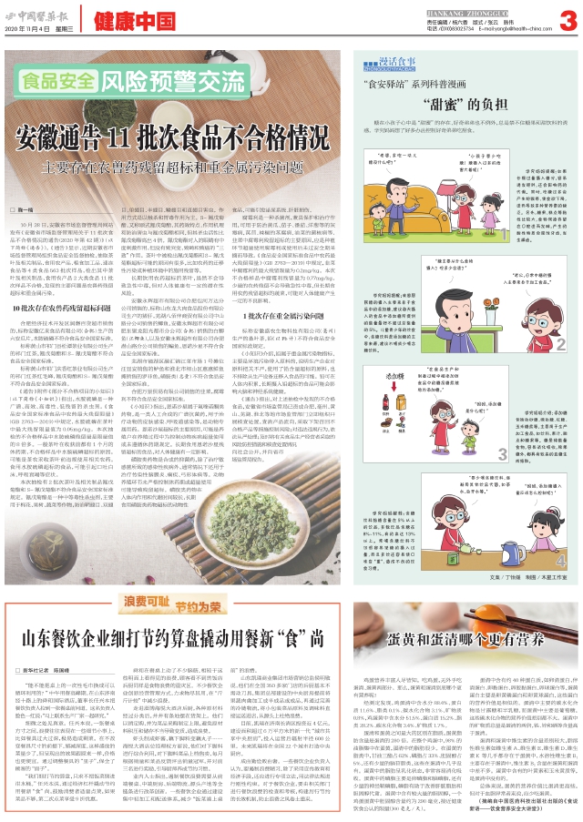 10月28日,安徽省市场监督管理局网站发布《安徽省市场监督管理局关于11批次食品不合格情况的通告(2020年第42期)》(以下简称《通告》)。《通告》显示,近期安徽省市场监督管理局组织食品安全监督抽检,抽取茶叶及相关制品、食用农产品、粮食加工品、速冻食品等4类食品563批次样品,检出其中茶叶及相关制品、食用农产品2大类食品11批次样品不合格,发现的主要问题是农兽药残留超标和重金属污染。