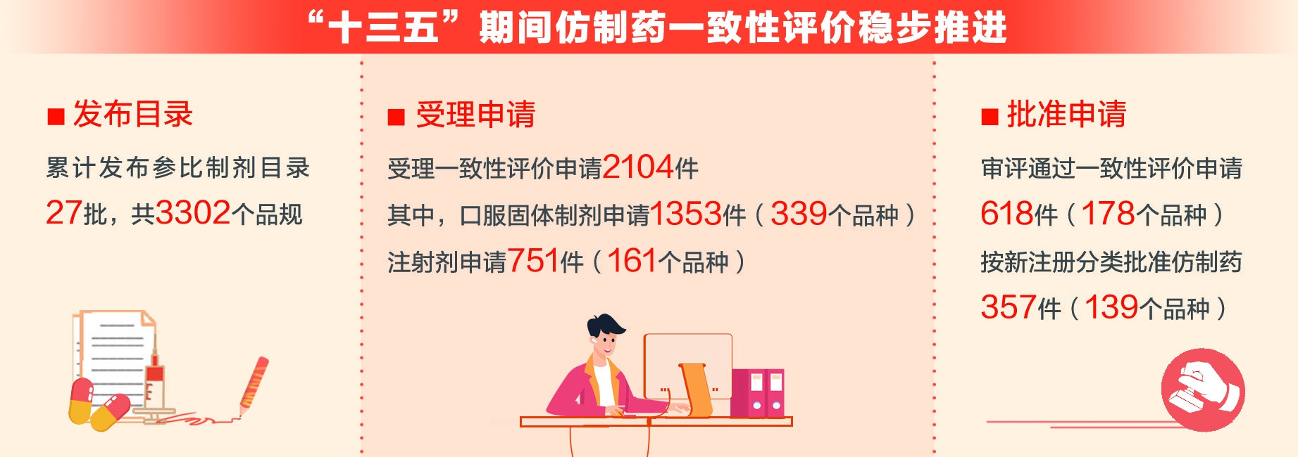 “十三五”时期,一致性评价工作全面推进,药监部门确定了一致性评价的工作程序和技术要求,保障了一致性评价受理、检查、检验及审评审批等各环节顺畅衔接,同时建立了符合国际通行做法的现代化仿制药审评体系。