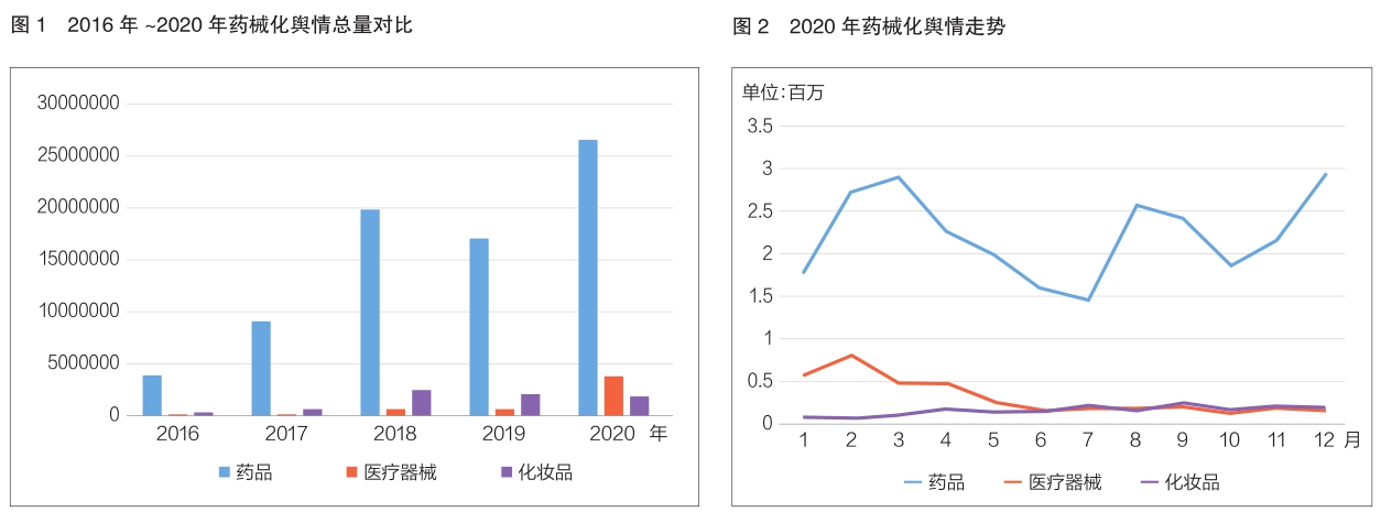 笔者通过中国健康传媒集团食品药品舆情监测系统检索发现,2020年药械化(药品、医疗器械、化妆品)舆情体量超过3200万条,再创新高。自2016年以来,药械化整体信息量呈上升趋势,2018年受个别疫苗事件影响,药品信息量有较大幅度增加;2019年药品舆情较为平稳;2020年受新冠肺炎疫情影响,药品、医疗器械相关信息量再次大幅升高(见图1)。