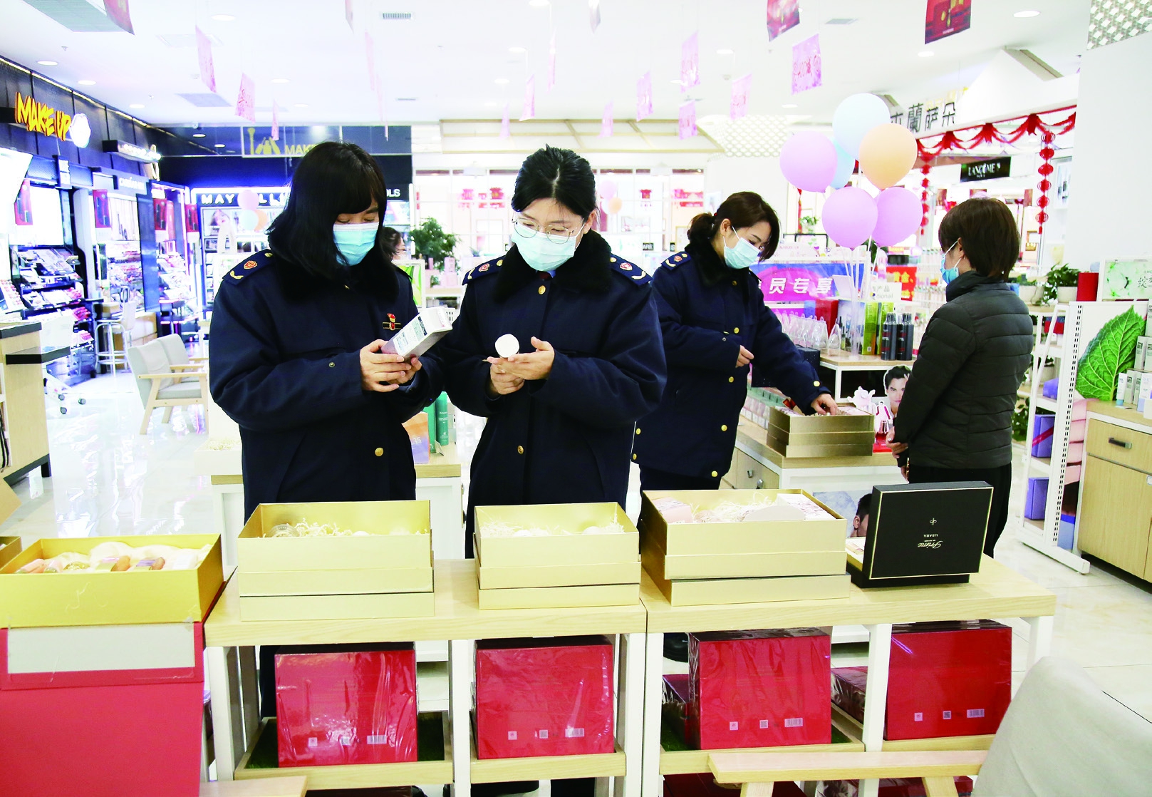 图为吉林省敦化市市场监管局执法人员排查化妆品经营环节安全隐患。