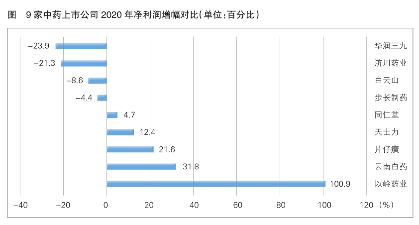 中药企业在迎来政策利好的同时,也面临新的挑战。根据上市公司财报,本文选取2020年净利润超过10亿元的9家中药企业,即云南白药集团股份有限公司(股票代码000538)、广州白云山医药集团股份有限公司(股票代码600332)、山东步长制药股份有限公司(股票代码603858)、漳州片仔癀药业股份有限公司(股票代码600436)、深圳华润三九医药贸易有限公司(股票代码000999)、湖北济川药业股份有限公司(股票代码600566)、石家庄以岭药业股份有限公司(股票代码002603)、天士力医药集团股份有限公司(股票代码600535)、北京同仁堂股份有限公司(股票代码600085),分析其2020年年报主要指标及企业发展情况。