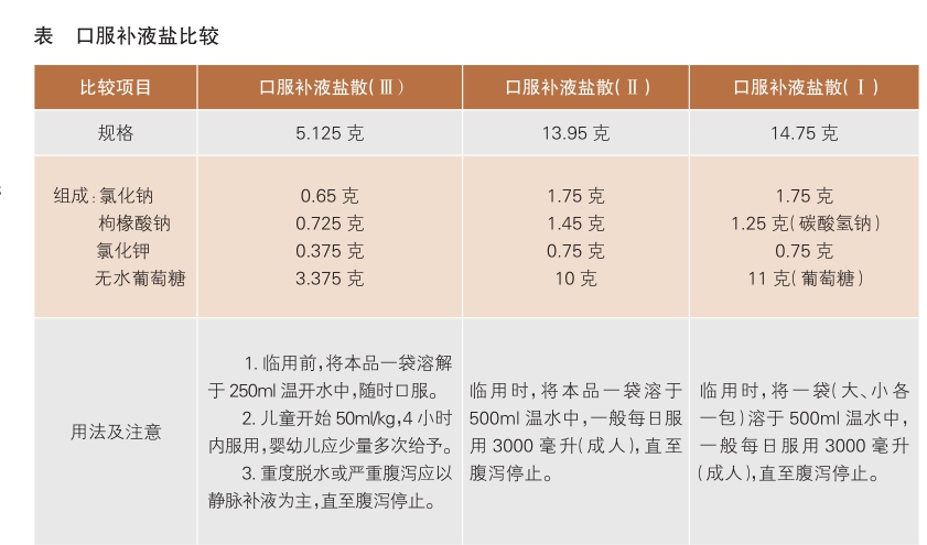 对于轻、中度脱水以及没有明显呕吐的患者,可使用口服补液疗法。市售口服补液盐有Ⅰ、Ⅱ、Ⅲ号之分,其中Ⅲ号更适合婴幼儿使用(见表)。