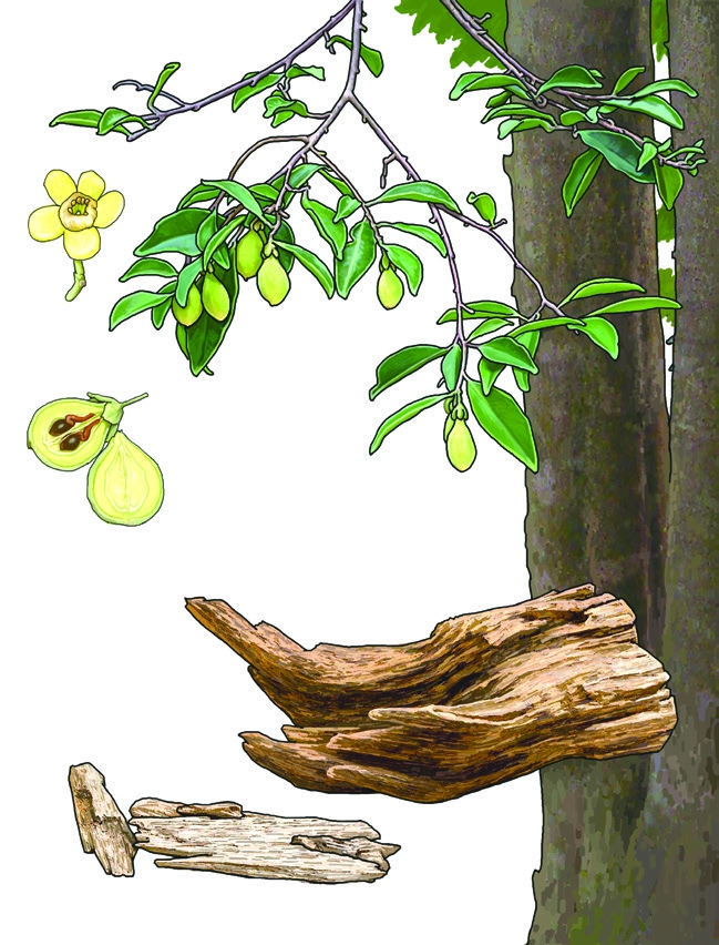 呈不规则块状、片状或盔帽状,有的为小碎块。表面凹凸不平,有刀削痕,偶有孔洞,可见黑褐色树脂与黄白色木部相间的斑纹,孔洞及凹窝表面多呈朽木状。质较坚实,断面刺状。气芳香,味苦。