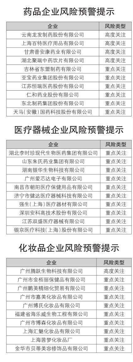 此次“两品一械”企业风险预警提示监测时段为5月1日至6月30日。由于监测平台数据滚动更新,风险预警提示会动态更新。药品领域