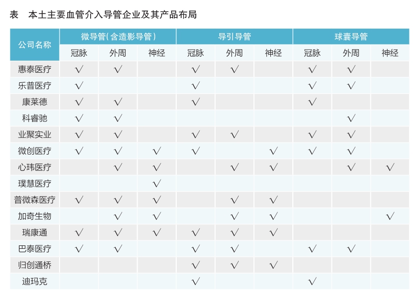 国内企业中,微创医疗(含下属企业)的血管介入导管产品布局较为全面,覆盖冠脉介入、外周血管介入、神经血管介入等各个领域;惠泰医疗、业聚实业、巴泰医疗等企业在冠脉介入、外周血管介入治疗领域有较全面的产品布局;心玮医疗在外周血管介入、神经血管介入领域的布局较为全面;乐普医疗、康德莱主要在冠脉介入领域布局(详见表)。