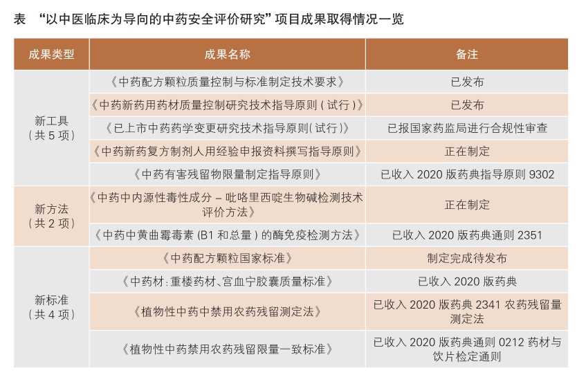 2019年4月,国家药监局启动中国药品监管科学行动计划,“以中医临床为导向的中药安全评价研究”是首批9个重点研究项目之一。该项目由国家药监局药品注册司、药品监管司牵头,国家药典委员会、国家药监局药品审评中心(以下简称药审中心)、中国食品药品检定研究院(以下简称中检院)组织实施,中国中医科学院、北京中医药大学、中国药科大学、浙江大学等为合作单位。两年多来,在各单位的共同努力下,该项目产出了一系列新工具、新标准、新方法,进一步完善和提高了中药监管政策和技术评价体系,促进了监管效率的提升。