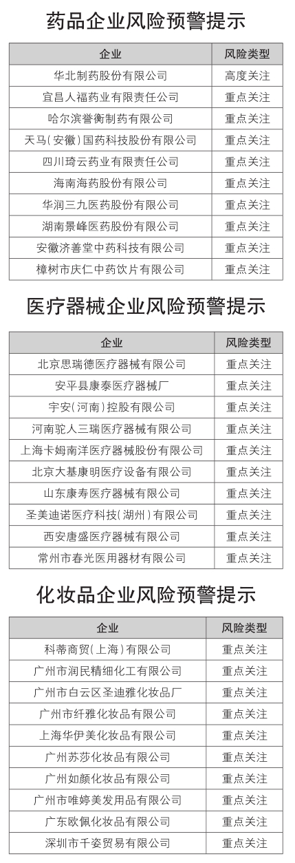 药品企业风险预警提示(2021年第九期)显示,华北制药股份有限公司(以下简称华北制药)风险指数排名第一,为“高度关注企业”;宜昌人福药业有限责任公司(以下简称人福药业)、哈尔滨誉衡制药有限公司(以下简称誉衡制药)、天马(安徽)国药科技股份有限公司(以下简称天马国药)、四川琦云药业有限责任公司(以下简称琦云药业)、海南海药股份有限公司(以下简称海南海药)、华润三九医药股份有限公司(以下简称华润三九)、湖南景峰医药股份有限公司(以下简称景峰医药)、安徽济善堂中药科技有限公司(以下简称济善堂中药)、樟树市庆仁中药饮片有限公司风险指数分列第二至十位,为“重点关注企业”。
