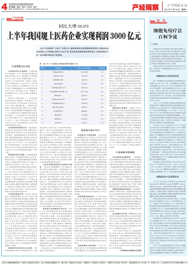 今年2月,国家药监局药审中心发布《免疫细胞治疗产品临床试验技术指导原则(试行)》,为该类产品开展临床试验的总体规划、试验方案设计、试验实施和数据分析等提供了必要的技术指导。