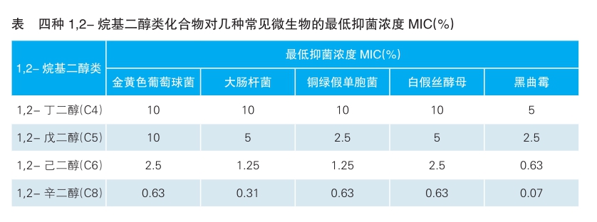 邻位二醇类化合物通常用于保湿润肤,还可作为溶剂或黏度调节剂。常见的具有抑制微生物生长作用的邻位二醇结构,指的是碳链为4~8个碳原子、2个羟基相邻并位于碳链一端。邻位二醇类化合物的碳链端亲油,羟基端亲水,即具有两亲性,能与细胞膜的脂质双分子层相互作用,增强细胞膜的通透性,因此可作为较好的抑菌增效剂。例如,当1,2-烷基二醇类化合物的碳链长度由4个增加到8个时,分子的水溶性随之降低,脂溶性则增加,最低抑菌浓度MI C(体外培养18~24小时后能抑制培养基内病原菌生长的最低药物浓度)降低,即抑菌效果增强(详见表)。