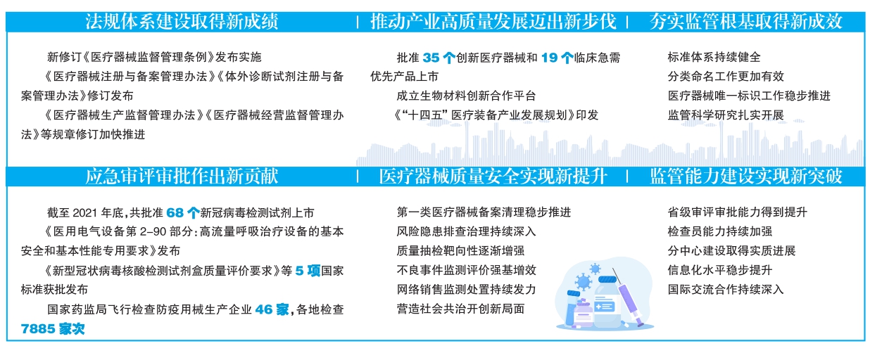 2021年是党和国家历史上具有里程碑意义的一年,也是我国医疗器械监管事业全面进步的一年。监管部门认真贯彻党中央、国务院重大决策部署,严格落实“四个最严”要求,新冠肺炎疫情防控产品上市稳步推进,审评审批制度改革持续深化,全生命周期质量监管不断加强,监管体系和监管能力建设步伐明显加快,各项工作有序有力推进,“十四五”医疗器械监管工作开局良好。