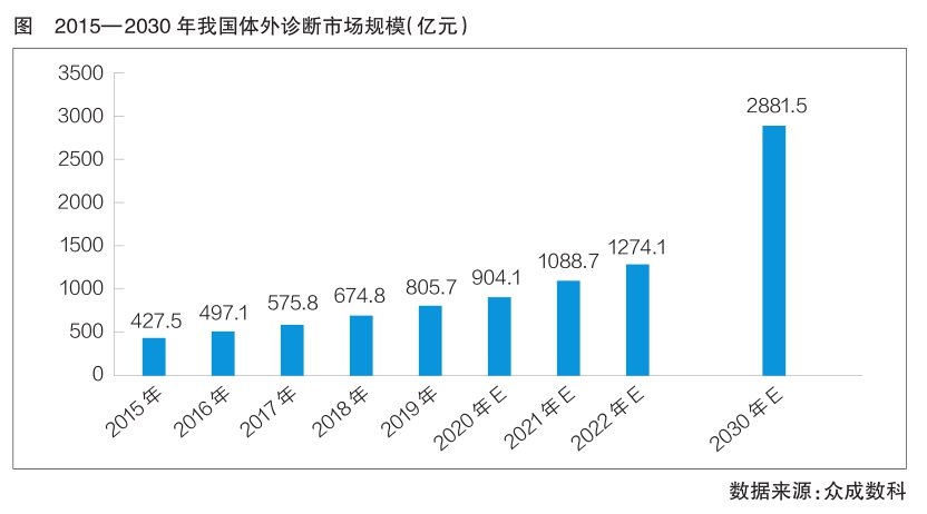 众成数科数据还显示,目前,全球IVD市场区域发展不平衡,按照2019年全球IVD市场规模计算,欧、美、日、韩等发达国家和地区市场规模占比超60%,我国占比约为17.6%。由于发达国家和地区的医疗服务体系相对成熟,其市场规模整体增速趋缓,而以我国为代表的新兴市场潜力巨大。2015年,我国IVD市场规模为427.5亿元;2019年,该市场规模达805.7亿元,年复合增长率为17.2%;预计到2030年,我国IVD市场规模将达到2881.5亿元,在全球市场规模的占比将提升至33%,有望成为全球最大的IVD产品消费国(详见图)。