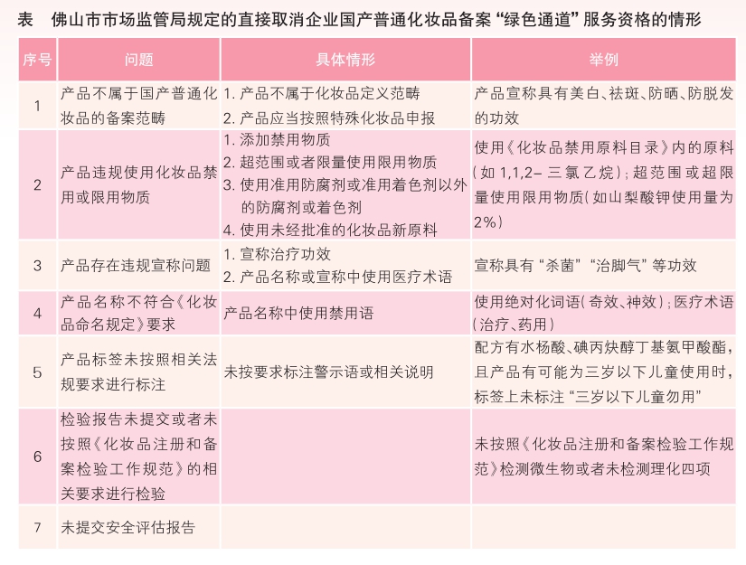 佛山市市场监管局明确,如有以下三种情形之一,企业将被取消“绿色通道”服务资格。一是直接取消情形,该类情形属于较为严重的违规情形,如产品不属于国产普通化妆品的备案范畴、产品违规使用化妆品禁用或限用物质、产品存在违规宣称问题、产品名称不符合《化妆品命名规定》要求、产品标签未按照相关法规要求进行标注、检验报告未提交或未按规定检验、安全评估报告未提交等(具体情形及举例详见表);二是产品备案资料因违反法律法规被相关部门通报的,且企业被通报产品数超过累计上限的情形;三是产品备案后被备案部门抽查发现问题的次数超过累计上限的情形。若备案部门在事中事后监管过程中发现企业存在以上情形,将立即取消其“绿色通道”服务资格,并将相关情况通报至监督和执法环节。