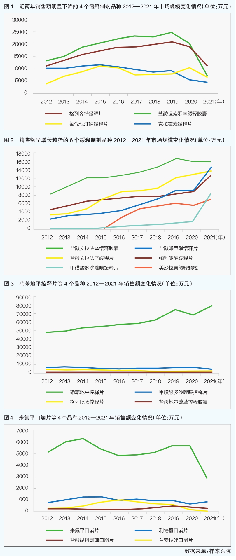 硝苯地平控释片、格列吡嗪控释片是当前的竞争热点。从2012—2021年样本医院销售情况来看,硝苯地平控释片销售额稳定上行,格列吡嗪控释片销售额整体趋稳但稍有下滑(详见图3)。