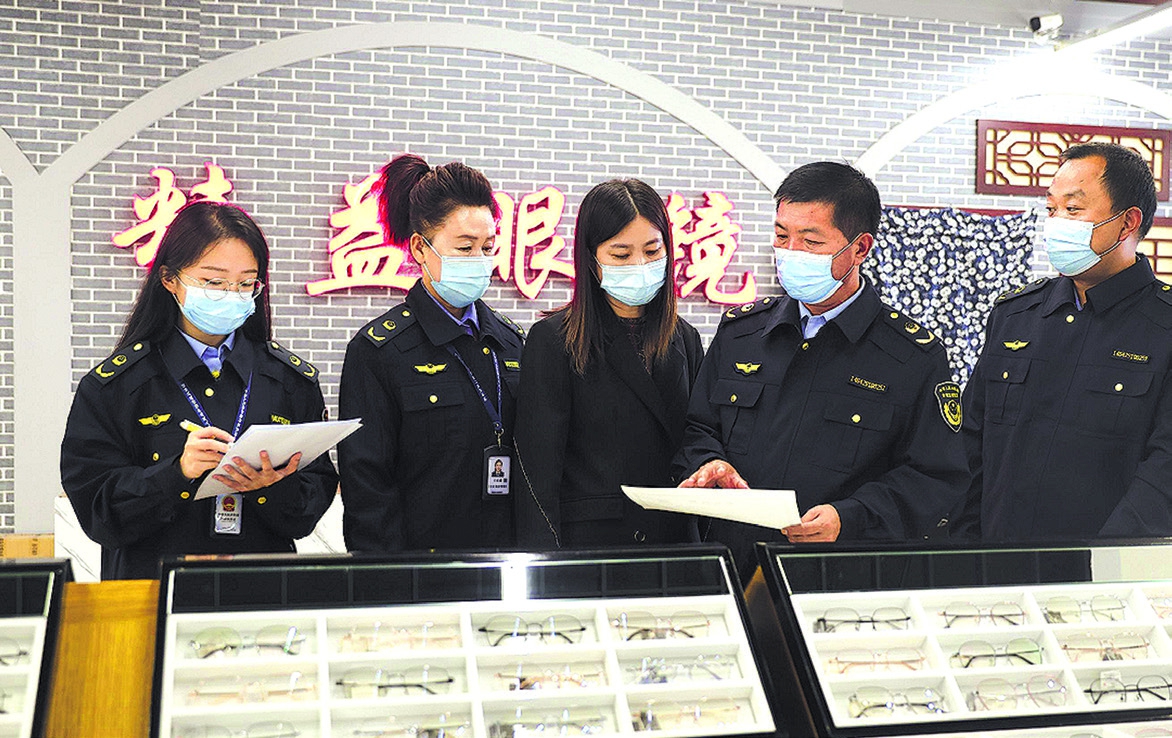 近日,山西省长治市武乡县市场监管局组织对辖区内眼镜店进行拉网式排查、高密度巡查和反复性检查,严厉打击无证经营或销售假劣装饰性彩色隐形眼镜等非法经营行为。图为该局监管人员在一家眼镜经营企业检查。 郝建蕾 摄