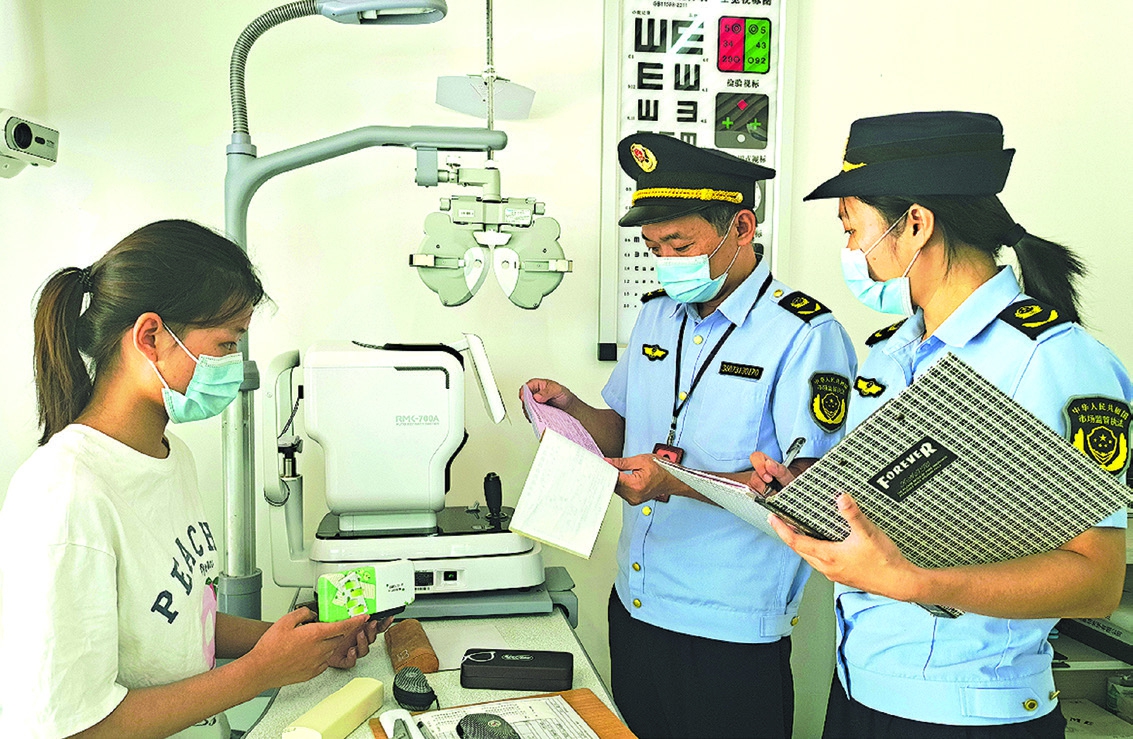 近日,江西省于都县市场监管局组织开展眼镜零售企业专项检查。专项检查以眼镜店、饰品店、化妆品店等为重点,采取暗访调查和突击检查等方式,重点整治无证经营装饰性彩色隐形眼镜等行为。图为该局监管人员在一家眼镜店检查。 王雨林 摄