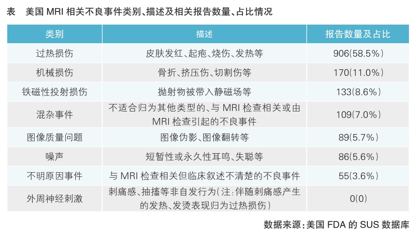 在上述不同类型的MRI不良事件中,过热损伤、噪声、图像质量问题、铁磁性投射损伤等比较常见或具有一定的代表性。这些MRI不良事件大多起因明确,在一定程度上是可以预防的。