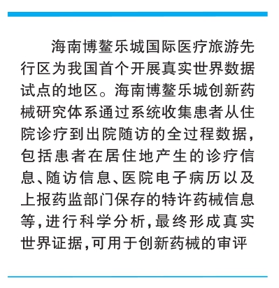 早在2017年10月,《关于深化审评审批制度改革鼓励药品医疗器械创新的意见》中就提到,为满足临床急需药品医疗器械使用需求,加快审评审批,上市后按要求开展研究,即真实世界研究。近年来,我国启动了真实世界数据研究用于创新药械评价与监管的探索与实践,海南博鳌乐城国际医疗旅游先行区(以下简称乐城先行区)为我国首个开展真实世界数据试点的地区。海南博鳌乐城创新药械研究体系通过系统收集患者从住院诊疗到出院随访的全过程数据,包括患者在居住地产生的诊疗信息、随访信息、医院电子病历以及上报药监部门保存的特许药械信息等,进行科学分析,最终形成真实世界证据,可用于创新药械的审评。