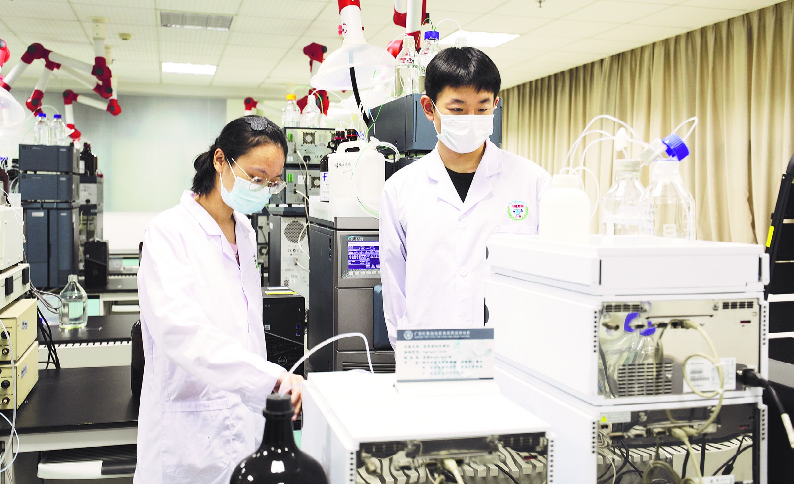 图为广西食药检验所检验人员运用化妆品高风险物质筛查鉴定技术平台开展化妆品检测。 陈淑贤 摄
