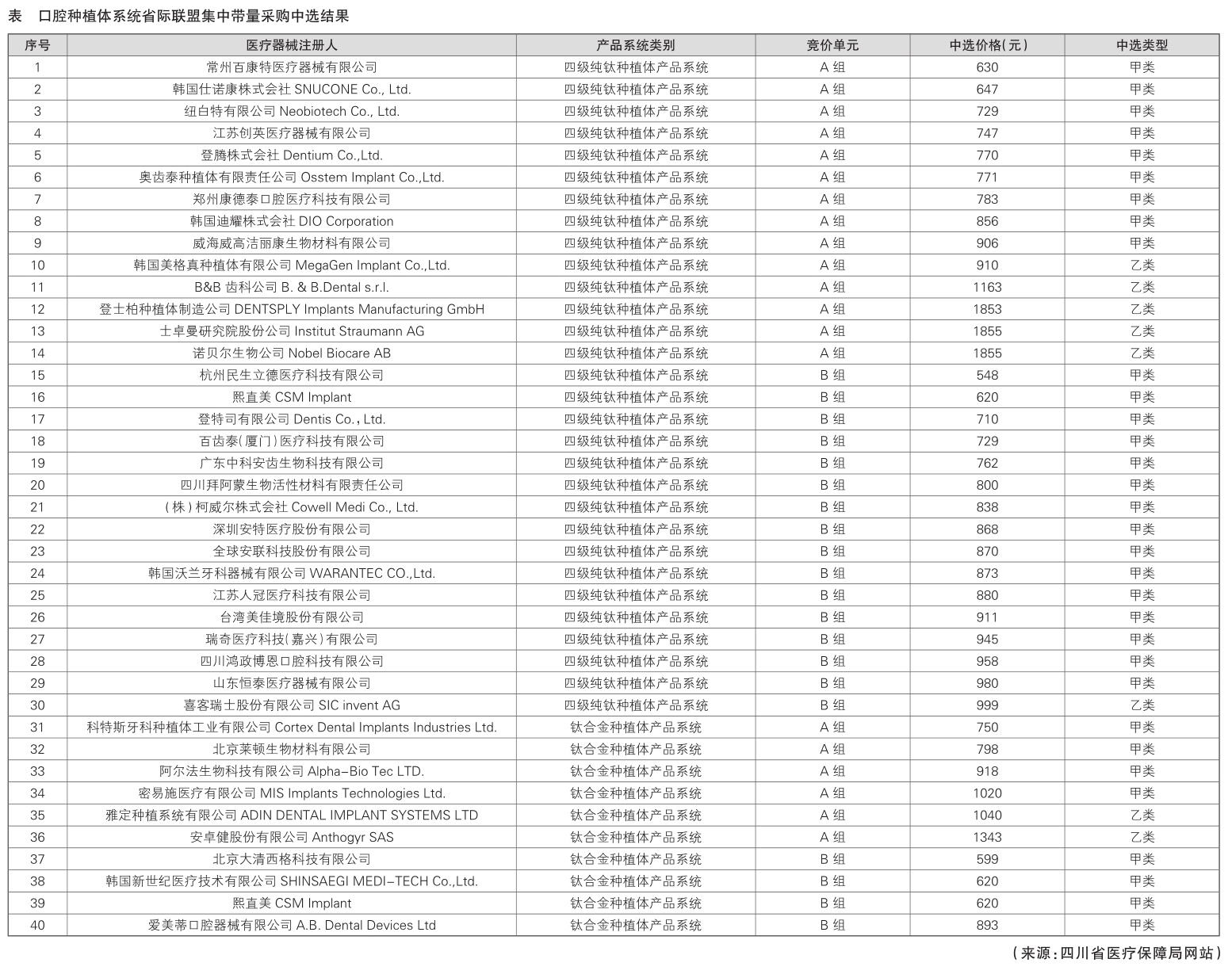 近日,四川省医疗保障局牵头的口腔种植体系统省际联盟集中带量采购(以下简称种植体集采)中选结果公布,被业内称为“高值医用耗材集采从医保领域扩围到非医保领域首次尝试”的种植体集采告一段落。此次集采共有40款产品中选,基本覆盖市场上的主流品牌,中选的种植体价格平均降幅达55%(详见表)。此次集采首年采购需求量达287万套,约占国内种植牙年用量(400万颗)的72%,预计每年可节约患者费用40亿元左右。