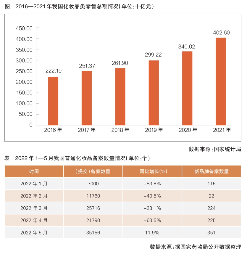 近年来,随着我国人均可支配收入不断提高,整体零售消费市场快速发展。国家统计局公开数据显示,2021年社会消费品零售总额达44万余亿元,同比增长12.5%。其中,化妆品类零售总额4026亿元(详见图),同比增长14.0%(限额以上单位消费品零售额),2016年至2021年年均复合增长率约11.1%。