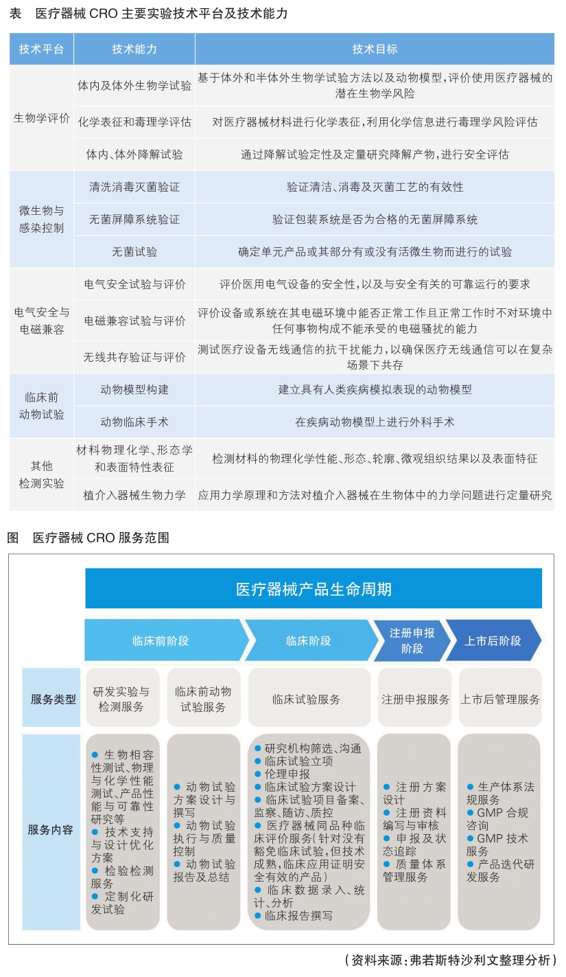 医疗器械CRO服务范围广泛,主要包括临床前的研发检测服务、动物试验服务,临床试验服务,注册申报服务,上市后的生产体系法规服务及产品迭代研发服务等,服务内容覆盖医疗器械全生命周期(详见图)。