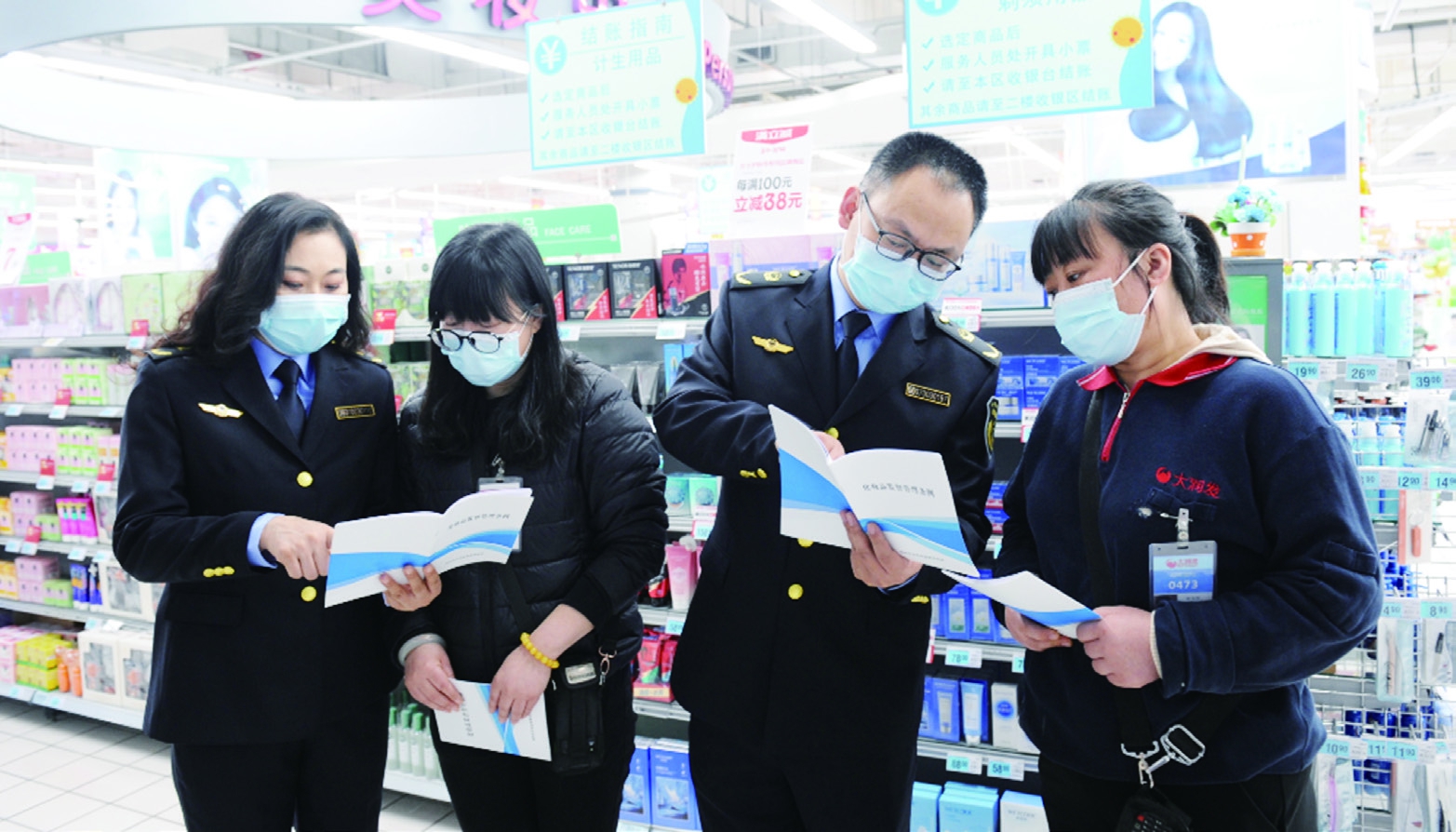 图为该局监管人员在一家商超向化妆品经营者宣传《条例》重点内容。