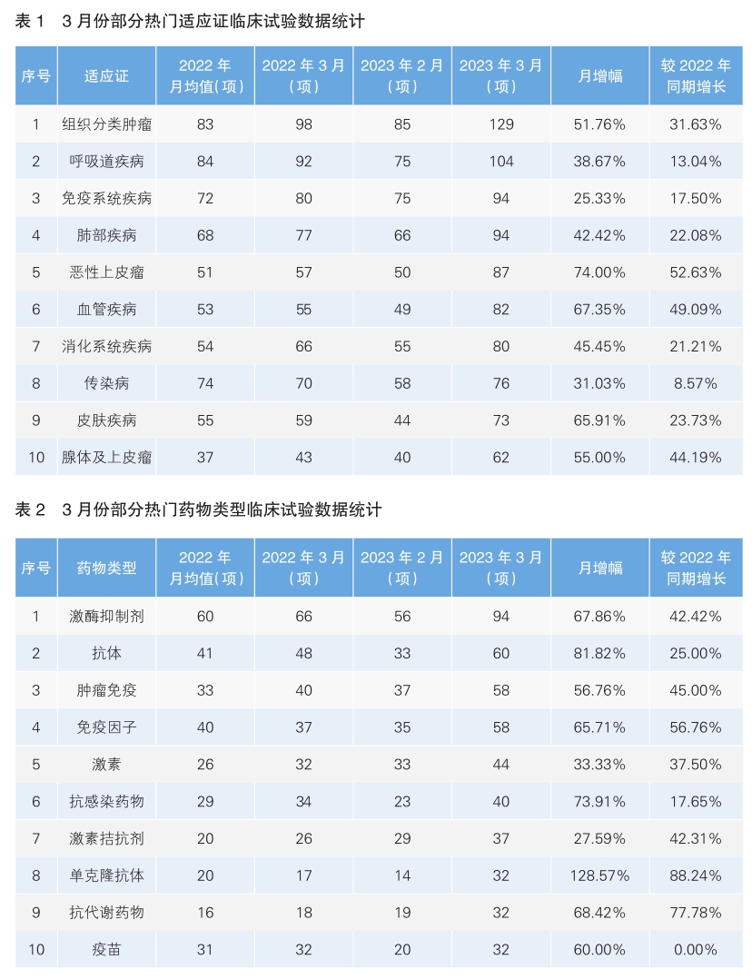 从3月份新增临床试验热门适应证领域来看,组织分类肿瘤仍为最主要的热门研发领域,试验数量为129项,相较2月份增长51.76%;其次为呼吸道疾病领域,数量相较于上月增加38.67%。月增幅最高的热门适应证为恶性上皮瘤,单月增幅为74%,其次为血管类疾病(67.35%)和皮肤类疾病(65.91%)。当月热门领域临床试验相较于上月及去年同期无下降领域,月增幅最小的热门领域为免疫系统疾病(25.33%),相较于去年同期水平上升幅度最小的领域为传染病(8.57%)。(详见表1)