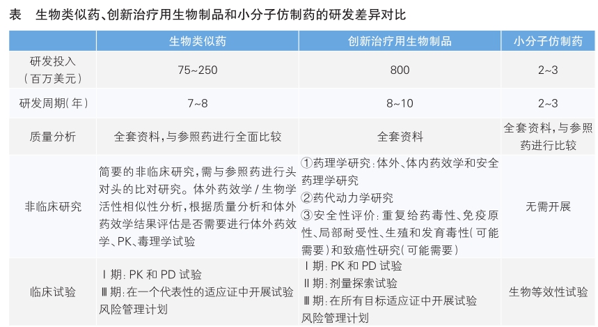 治疗用生物制品的复杂性及对生产工艺和环境因素的敏感性,使得生物类似药的结构不可能与参照药完全相同。生物类似药只是与参照药在质量、有效性和安全性上相似的药物,但可能存在没有临床意义的差别。这与小分子仿制药不同。小分子药物的结构简单、明确,可被完全复制。