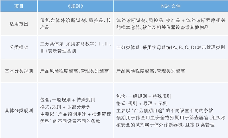 同时,也存在部分产品因监管思路不同而管理属性不同的情况。例如,用于血源筛查的体外诊断试剂,依据N64文件认为其符合医疗器械定义且应按照D类管理;但在我国,这类产品应按照药品管理,未包含在《规则》适用范围内。