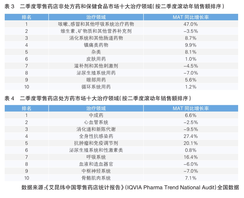 纵观主要治疗领域,感冒咳嗽类、维生素矿物质类和消化系统品类销售额仍稳居非处方药和保健食品市场前3位置,其中感冒咳嗽类销售额增速最高,MAT增长率达到47%(详见表3)。