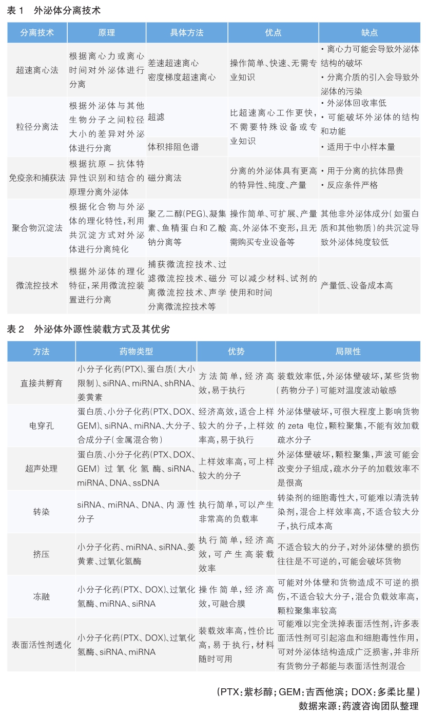 外泌体作为一种潜在的药物递送系统,类似于脂质体,具有包裹亲水核心的独特双脂膜,可装载亲水和亲脂材料;由于外泌体具有不同脂质、表面蛋白、受体等,具有更好的组织和细胞靶向性;此外,外泌体由细胞自身产生,具有较好的生物相容性、低免疫原性和低毒性,可避免外源性的蛋白类、核酸类等药物进入体内被免疫系统识别而遭到清除。目前,应用外泌体载药的药物类型主要为小分子化药、核酸和蛋白质。