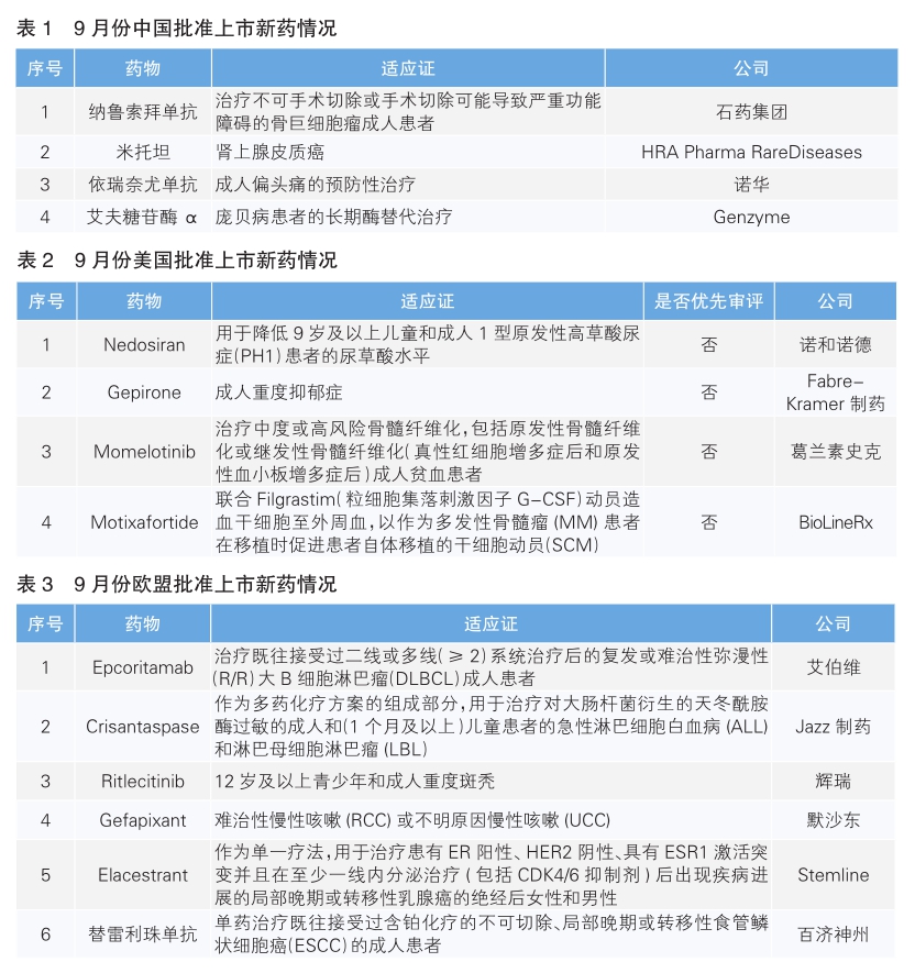 9月份,我国批准了4款新药上市。根据Pharmadigger数据库,纳鲁索拜单抗为我国自主研发且在全球范围内首次获批上市的新药(详见表1)。