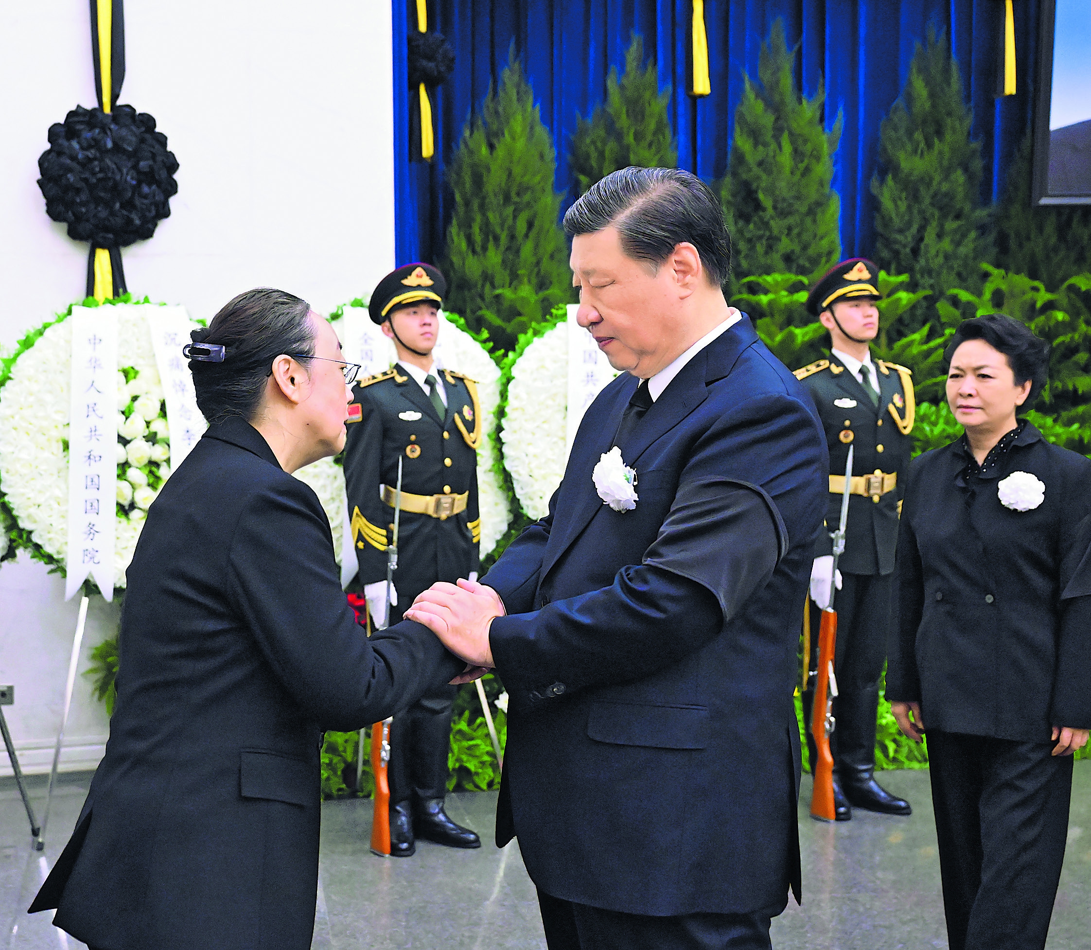 上午9时许,习近平和夫人彭丽媛,李强、赵乐际、王沪宁、蔡奇、丁薛祥、李希、韩正等,在哀乐声中缓步来到李克强同志的遗体前肃立默哀,向李克强同志的遗体三鞠躬,并与李克强同志亲属一一握手,表示慰问。胡锦涛送花圈,对李克强同志逝世表示哀悼。