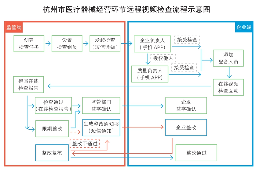 杭州市市场监管系统根据年度监管计划,在医疗器械经营智慧监管平台创建检查任务后,系统自动通过APP或监管平台向企业发出检查通知,提醒企业在规定时间内做好检查准备。企业如3次以上逾期未按要求做好准备,系统则将其纳入线上异常企业,转为线下检查核实。企业负责人在岗的可直接接受任务并陪同检查,如不在岗可授权质量管理人员接受检查任务并陪同检查。检查过程中,监管人员通过手机APP进行视频在线检查,发现问题后以图片固证,按规范要求填写在线检查报告,企业签字确认。检查结束后,系统根据检查缺陷项向企业发出整改通知。企业完成整改后,可通过系统上传整改资料;监管部门跟进复核,完成检查闭环管理。