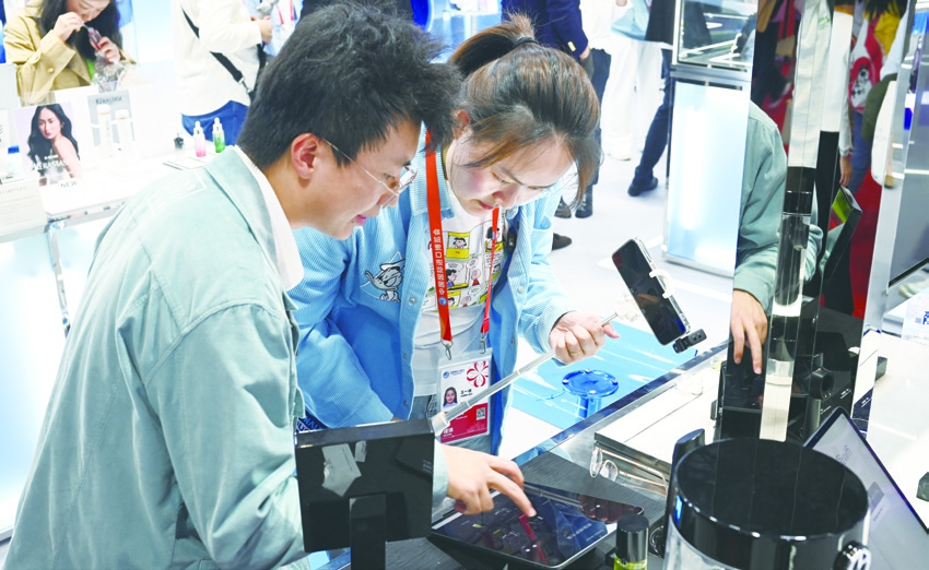 在进博大舞台,美妆企业不仅推出化妆品产品,与之相关的智能化产品也频频上新。流连各大化妆品企业展台,记者看到辅助上妆工具、皮肤检测产品吸引了众多参观者体验、互动,趣味感十足。