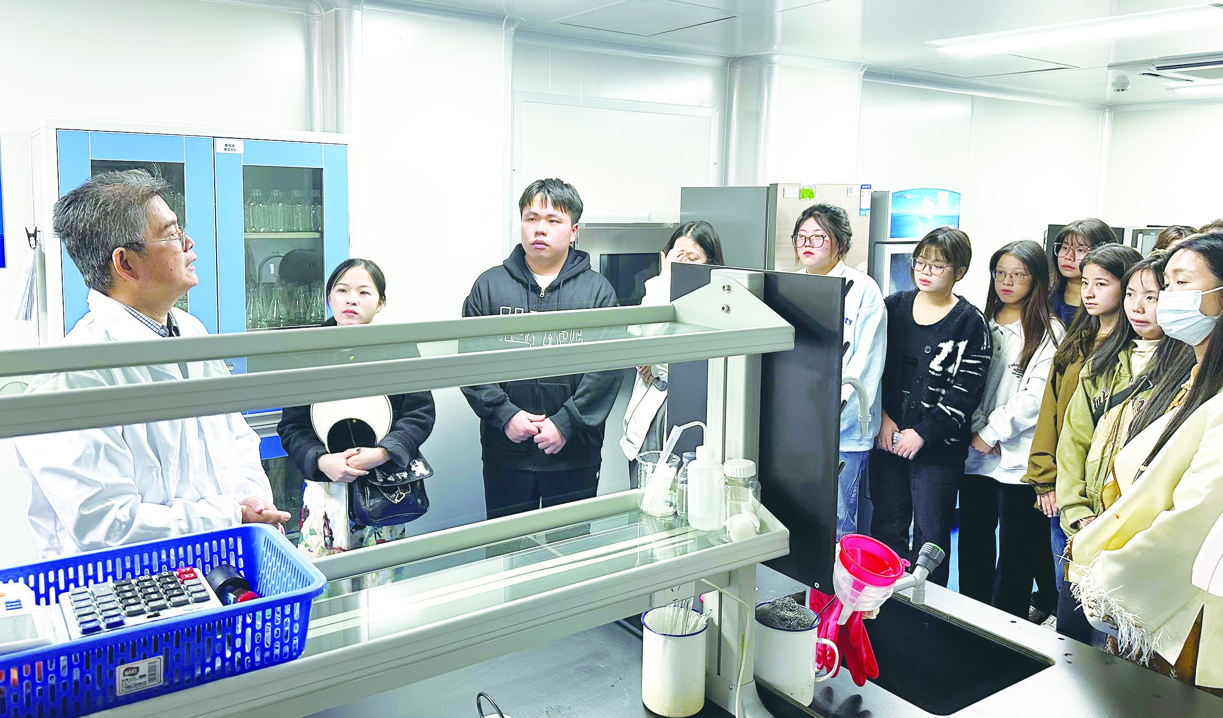 图为该所工作人员在讲解药品检验仪器的功能、原理和操作要求等,帮助师生代表更加直观地了解药品检验工作。