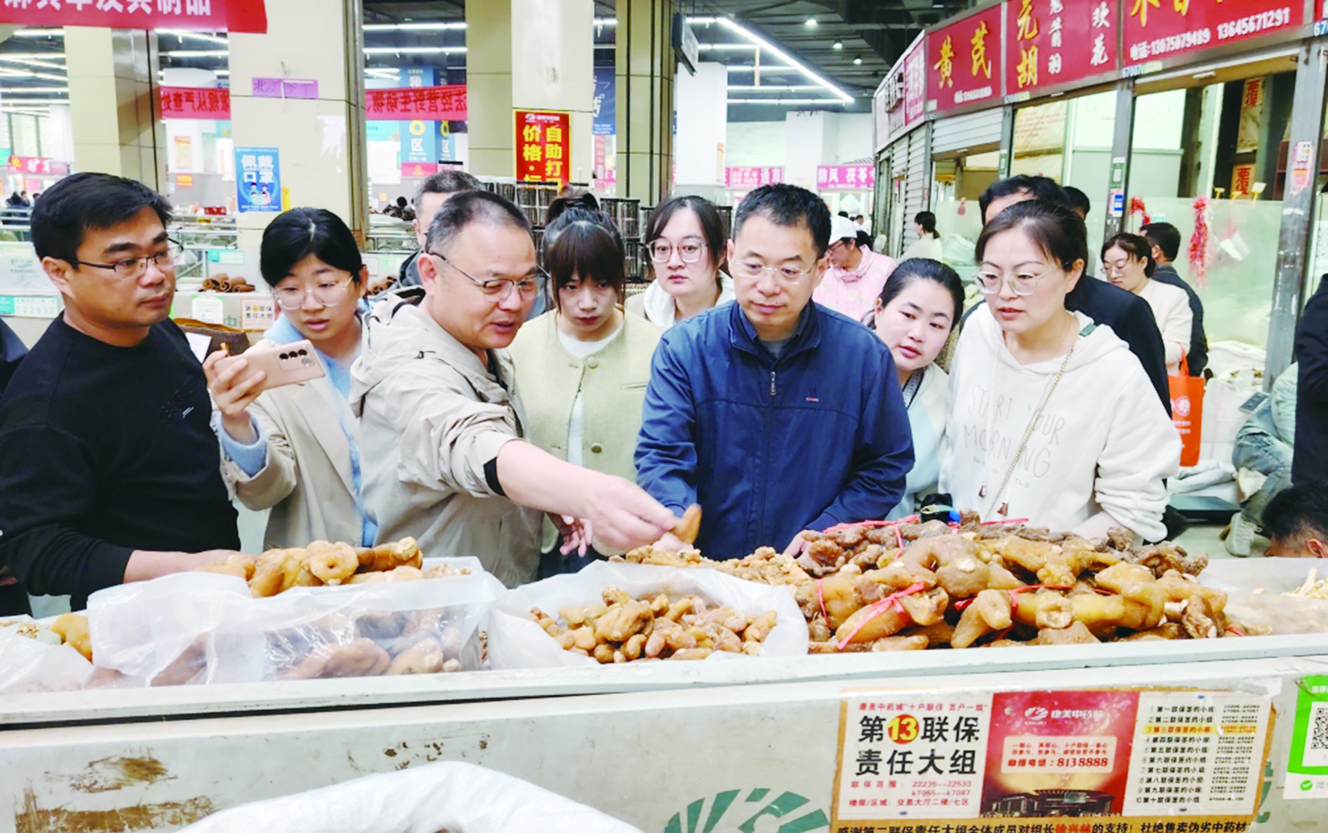 图为参训人员在亳州中药材专业市场学习中药材鉴别技巧。