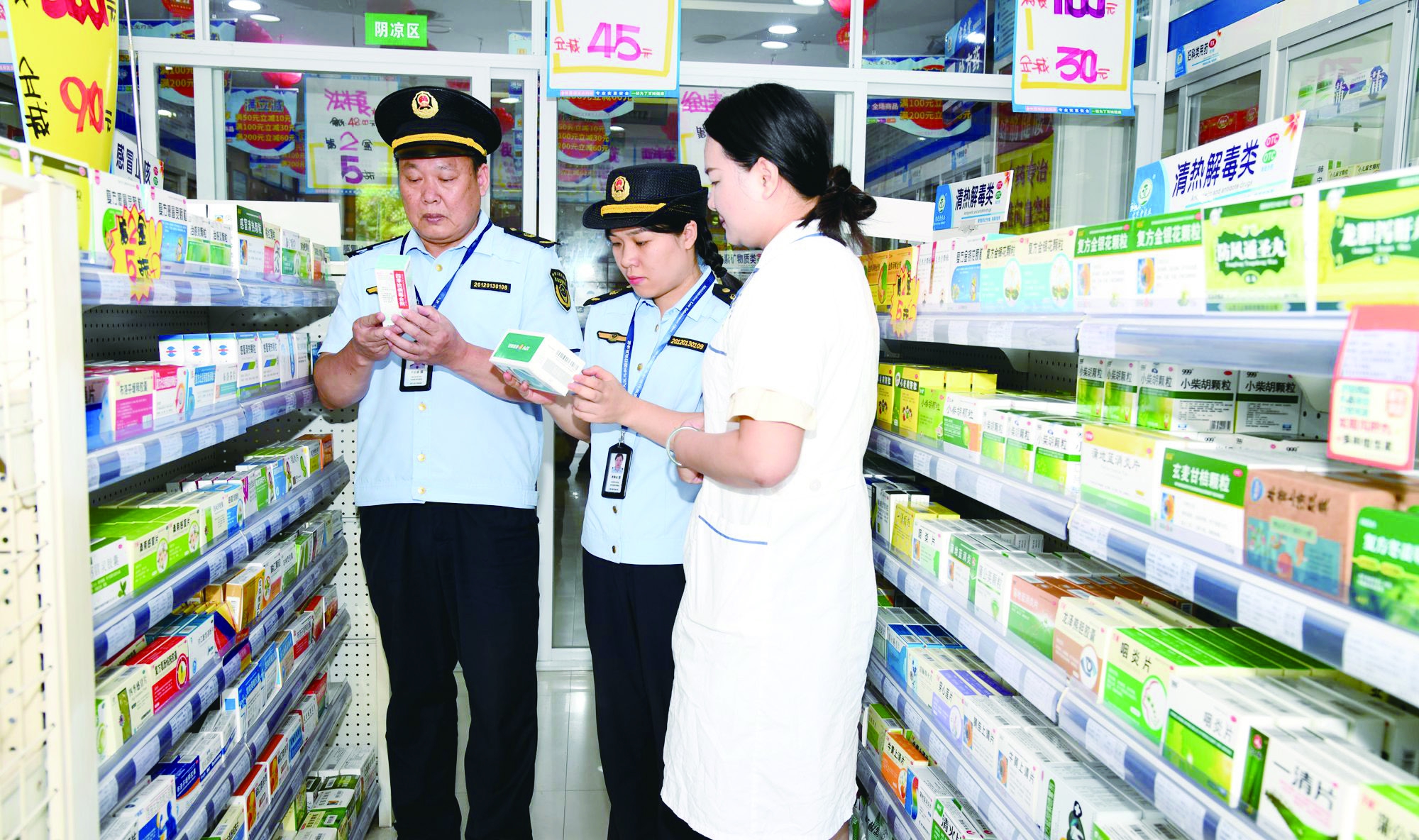 图为该局监管人员在一家药店检查药品保质期等情况。